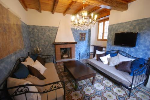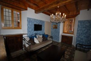Gegenüber der Wohnküche befindet sich das Wohnzimmer, ebenfalls mit großem offenem Kamin. Das Wohnzimmer ist ausgestattet mit 2 großen Sofas mit Lattenrost und Federkernmatratzen (90 x 200 cm). Die Sofas können als vollständige Betten verwendet werden. Im Wohnzimmer befindet sich zu dem SAT-TV, DVD Player und ein Flachbildfernseher.